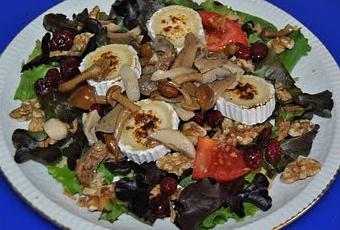 Cortar el queso de cabra en rodajitas o bien comprarlo ya cortado, ponerlo sobre la ensalada y quemadlo con un soplete.