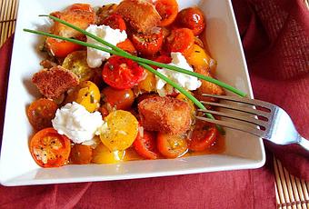 Tomates Sherry de distintos colores y clases.Cebolleta tiernaMozzarella de búfalaTomillo fresco o semillas de hinojoCebollino AjoPanPimienta negraAceite de olivaSal