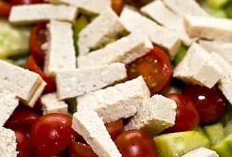 Lleva tomates, pepino, cebolla, pimiento (crudo o asado) y queso blanco vegano casero de soja y avena, todo ello cortado en dados.