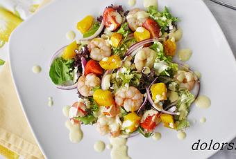 En una fuente colocar los brotes tiernos, la cebolla repartida, los tomatitos, los dados de mango y las gambas salteadas. Repartir la salsa por encima.