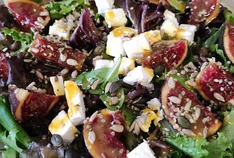INGREDIENTES: para 2 personas 150 g de hojas verdes de lechugas a tu gusto o una mezcla de las que vienen envasadas, brotes tiernos, rúcula, canónigos... al gusto.2-4 higos frescos de buen tamaño, con la piel muy firme 100 g de queso feta (o rulo de cabra, o fresco, o mozzarella... como prefieras) nueces, pipas de calabaza o girasol o semillas para dar un punto crujiente Para la vinagreta de miel: 4 c/s de aceite de oliva virgen extra, 1 c/s de zumo de limón 1 c/p de mostaza (mejor mostaza antigua) 1 c/s de miel o sirope de arce s/a