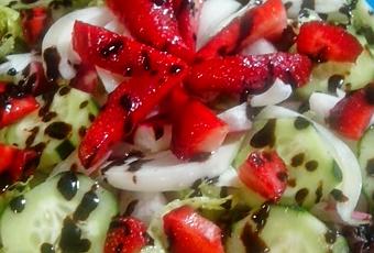 Preparación:Preparamos una fuente para ensalada.Lavamos bien la lechuga y la cortamos a trozos pequeños escurrimos y ponemos en la ensaladera.Lavamos y pelamos el pepino dejando algún trozo de piel para que resalte el verde en nuestra ensalada y así ademas como dicen no se repetirá su sabor, cortamos a rodajas y añadimos.Pelamos la cebolla, la partimos a trozos y también añadimos.Lavamos los rábanos y los cortamos a trozos.Lavamos bien las fresas las partimos a trozos y adornamos la ensalada.Ponemos la sal, aceite y la crema balsámica.Y a disfrutar de nuestra ensalada verde con fresas.Espero que os guste.