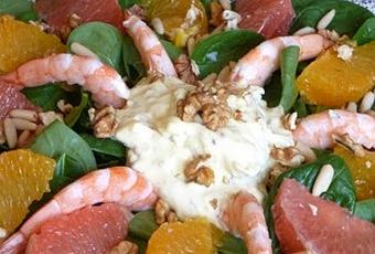 En una fuente llana grande ponemos hojas de espinaca fresca que cubra bien el fondo. Ahora, sobre la tabla de madera y con un cuchillo bien afilado pelamos el pomelo y la naranja y vamos sacando gajos pero sin la piel que los recubre. Los vamos colocando sobre la ensalada de forma alterna, pomelo naranja pomelo naranja, alrededor de la ensalada.