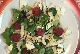 Se lavan y cortan las lechugas o se utiliza una bolsa de mezclum de lechugas ya listas para consumir. Se dispone en cada plato o en ensaladera la lechuga, se añade la pechuga de pollo desmenuzada, se lava y corta el apio en rodajas pequeñas y se incorpora también.