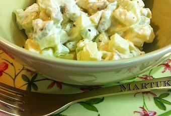El plato contiene manzanas troceadas, apio (o apio-nabo), frutos secos (generalmente nueces, incorporadas en la receta a partir del siglo XX) y una mayonesa de mostaza.La receta que os propongo está tomada de Las recetas de la familia de Ferrán Adriá, una App genial que muestra 31 menús para todos los días y que el genial cocinero preparaba para sus empleados en el restaurante.