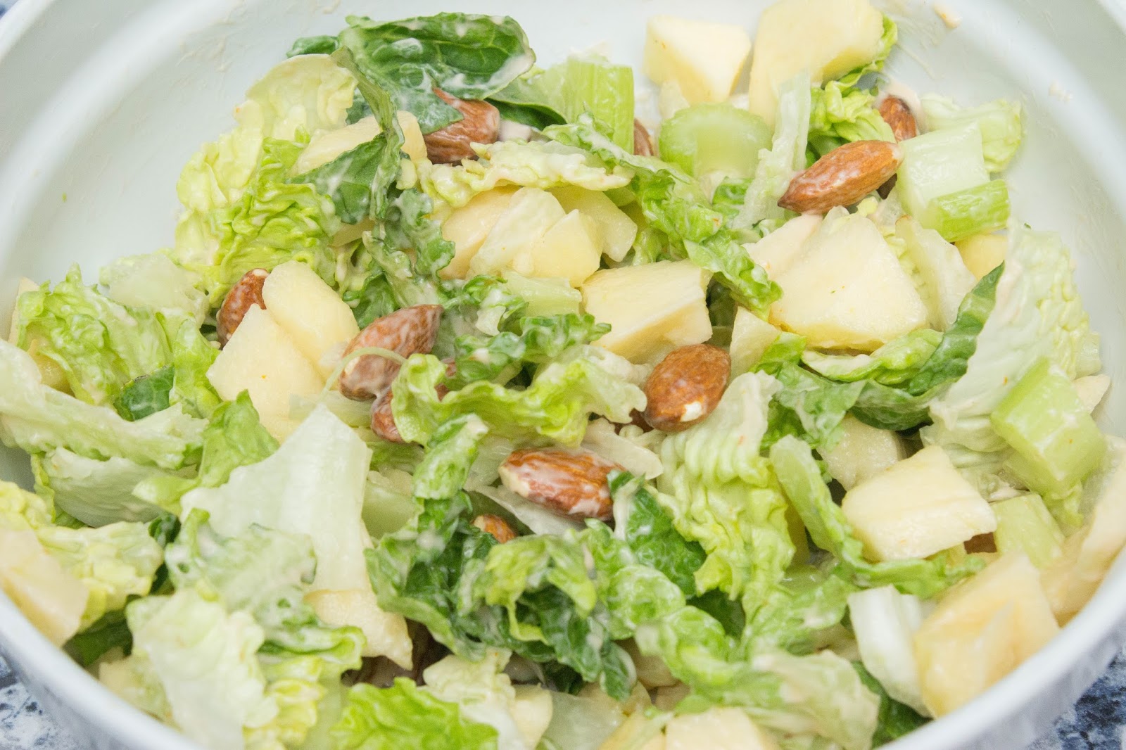 Ingredientes:1 rama de apio1 manzana1 cogollo de lechuga1 puñado de almendraskepchupmayonesa