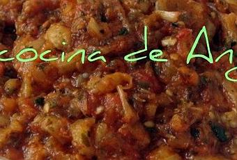 Deliciosa ensalada de berenjena y tomate marroquí.- Asar 1 ó 2 berenjenas en el microondas: lavarlas, cortar la zona del rabo, abrir por la mitad, hacer unos cortes en diagonal, salar ligeramente, echar un chorrito de aceite y asar a máxima potencia en el micro 4´ por cada lado. Dejar enfriar ligeramente, quitar la piel y trocear la pulpa.