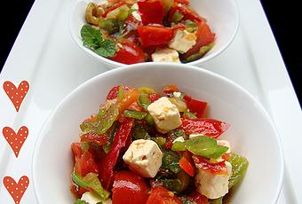 Partir los tomates cherry y las aceitunas por la mitad. Partiremos los pimientos en lonchas gruesas. Rallaremos la cebolla y la reservamos. Trocearemos el queso feta y mezclarlo todo. Prepararemos la vinagreta cortando muy finamente la hierbabuena y mezclando todos los ingredientes de la misma. Regar la ensalada con la vinagreta y lista para comer.