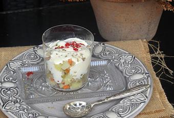 Presentas en un vaso de pinta o de sidra, al que incorporas primero la ensaladilla y por último la mayonesa. Adornas con el sucedáneo y las hierbas que tengas por ahí o más te gusten.