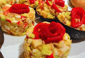 Servir la ensaladilla de aguacate y manzana decorada con tiras de piquillos.