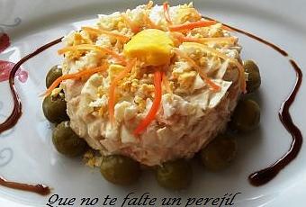 Yo la he presentado usando un aro de emplatar, con /2 yema de huevo encima y el resto picada, alrededor las aceitunas y un poco de zanahoria rallada. Para pintar el plato utilizo vinagre balsámico de Módena. Pero cada cual a su gusto.