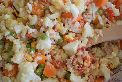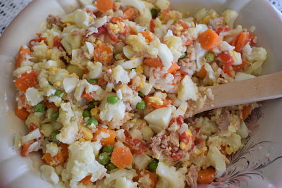 Pon 1 litro de agua en el vaso de la thermomix. Cierra el vaso con la tapadera sin cubilete y coloca en el recipiente varoma la coliflor cortada en ramitos pequeños. Programa 30 minutos, temperatura varoma, velocidad 1.Cuece de la misma forma las zanahorias y los guisantes. Estos últimos tardarán menos tiempo (puedes realizar la cocción de estos ingredientes en una vaporera).Espera a que se enfríen. Ponlos en una ensaladera grande, añade el atún escurrido de aceite, los huevos duros picados, el pimiento morrón picadito y escurrido.