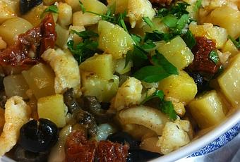 Se pelan las patatas cocidas y se cortan en dados pequeños (lo que vuestra paciencia os permita). Se pica la cebolleta y se dispone en una ensaladera las patatas, el bacalao, la cebolleta, las aceitunas picadas y los tomates desecados (partidos en trozos no muy pequeños).