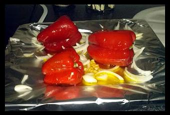 Lavamos los pimientos y los ponemos en la bandeja del horno, le añadimos un choro de aceite lo extendemos a cada pimiento con una brocha o la mano, para que estén mojados bien en aceite y le añadimos sal, cogemos la cebolla y la cortamos en tiras, la incorporamos como muestra la foto, los dientes de ajo solo rajados sin pelar y se meten en el horno a temperatura de 180º unos 20 minutos por cada lado.