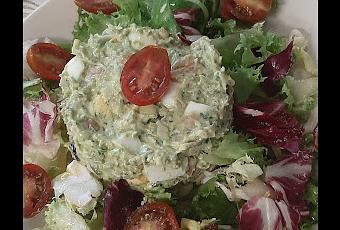 INGREDIENTES:(por persona) 200 gr de Aguacate (1 pieza) 2 Huevos de gallina cocidos (2 unidades M) 25 gr de Aceituna negra (10 unidades aprox.) 15 gr de Pepinillos (2 unidades aprox.) 35 gr de Crema de queso natural 1 c/s de Aceite de oliva (14 gr aprox.) 1 c/s de Zumo de limón (20 gr aprox.)