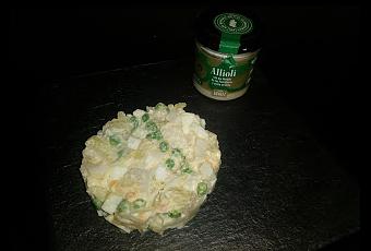 Una vez que ya tenéis todos los ingredientes preparados, peláis la patata y la cortáis en trozos pequeños, hacéis lo mismo con el huevo, la sepia y la cebolla. Echáis todo en un bol junto con los guisantes y añadís alioli al gusto y la metéis a la nevera hasta el momento de servir.