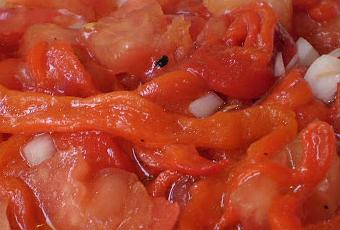 Poner al fuego directamente (o en el horno si no se pueden asar al fuego): pimientos rojos bien gordos y tomate maduro (que sea hermosito).Una vez asados, se pelan y se quitan las pepitas, en una fuente se ponen los pimientos cortados en tiritas finas, los tomates muy picaditos, cebollita blanca dulce picada en trocitos pequeños.Salar al gusto, añadir vinagre de vino y aceite de oliva virgen extra, remover bien,