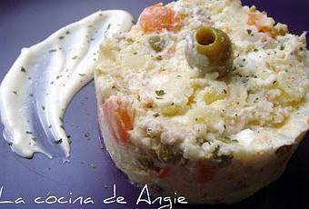 - Cocer patatas, zanahorias, guisantes y huevos. Trocear todo y mezclar con aceitunas picadas, atún en aceite escurrido y mayonesa. Servir fría.