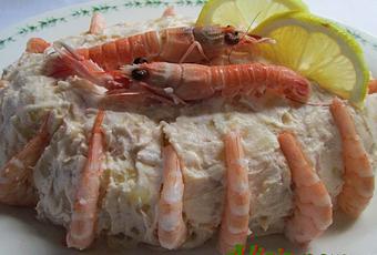 Dejamos que enfríe y luego ponemos la mayonesa (si es casera ponedle limón en lugar de vinagre, así era la clásica) con la que impregnamos bien patatas y gambas. Adornamos como más guste, pero no metáis huevos cocidos, ni morrones, tal cual, en estado puro, con la misma gamba, "la chorretada" mía ha sido poner las cigalas que andaban ellas "viudas".