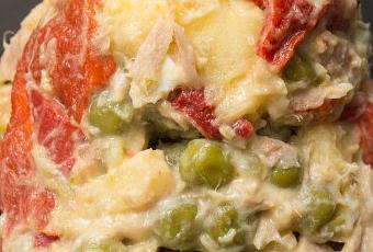 3 patatas1 lata de aceitunas1 tarro de guisante paladar selecto 1 tarro de melva en aceite paladar selecto1 tarro de pimientos de piquillo en tiras paladar selecto1 tarro de pepinillos paladar selecto2 huevos cocidos