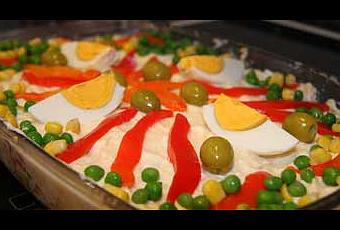 Decoramos con las yemas de huevo desmenuzadas y el huevo entero que cortaremos en gajos, con tiras de pimiento y algunas aceitunas.
