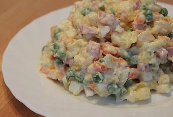 Algunas cosas que deberíais saber sobre la Olivier es que, en realidad, en lugar del jamón cocido*, que es el que más se parece al que usan los rusos, se le pone una cosa llamada Doktorskaya kolbasa (que es un producto bajo en grasa, una especie de salchicha cocida). También se le suele poner pepinos agrios marinados que podéis encontrar en cualquier tienda rusa. A mi me gusta el sabor que le da, pero como me ha aconsejado mi abuela y mi madre que no le ponga porque éstos nos harían la ensalada agria, no le he puesto. Además de que no los tenía por casa. Bueno, esto según los gustos.