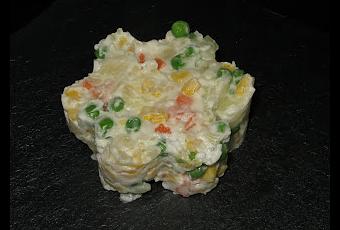 Ingredientes:- 2 patatas.- 50 gramos de guisantes.- 2 zanahorias.- ½ bote de maíz.- ¼ cebolla.- Veganesa:o 200 mililitros de aceite de girasol.o Sal.o ½ zumo de limón.o 100 mililitros de leche de soja.Elaboración:Comenzamos elaborando la veganesa es como una mayonesa normal, pero sustituyendo el huevo por la leche de soja. Se echa en el vaso de la batidora la leche de soja, la sal, el zumo de medio limón y 100 mililitros de aceite de girasol, podéis cambiarlo por el de oliva si queréis un sabor más intenso, batís s mover el brazo de la batidora y vais añadiendo el resto del aceite y comenzáis a emulsionar la mezcla. Una vez realizada la metéis en el frigorífico.Cocéis por un lado las patatas con la zanahoria, dependerá del tamaño de las patatas se sabe cuándo están cocidas clavándolas un cuchillo, si sale bien ya están listas. Por otro lado cocéis los guisantesa no ser que sean de bote. Ahora pelamos las patatas y la zanahoria y cortamos en trozos pequeños, añadimos los guisantes, la cebolla cortada, el maíz y veganesa al gusto y ya está lista para comer. También podéis añadirle pimientos verdes o rojos o algún tipo de encurtido como el pepinillo.