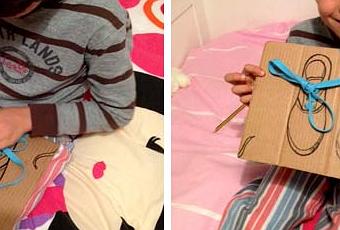 Para elaborar este divertido juego para niños tan sólo necesitas un cartón, un rotulador y unos cordones de zapatos. Pinta unas zapatillas con el rotulador y con unas tijeras abre unos agujeros por los que meter los cordones. Gracias a este juego aprenderán a hacer lazos, a colocar los cordones rectos, cruzados…