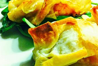 - Corta las hojas de pasta filo en cuadrados de unos 15cm de lado y coloca en el centro una buena cucharada de la mezcla. Cierra los lados formando paquetitos (moja con un pincel los extremos de cierre para que quede sellado). Bate la yema de huevo y pinta los paquetitos por encima para que queden dorados al hornear. Colócalos en una bandeja e introdúcela al horno, previamente precalentado, a 200º durante 10’-12’ o hasta que veas que están dorados.