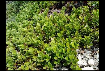 Arbusto perenne, rastrero muy ramificado, de corteza rojiza y frágil que tapiza los suelos imprimiendoles un color verde todo el año debido a sus numerosas hojas de color verde oscuro y lustrosas.