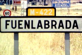 Imagen de 1979 de un primer plano de la señal de la carretera que une Fuenlabrada con Leganés, la antigua M-422, y actual M-409. La carretera era de un carril por sentido. Al fondo vemos unos postes publicitarios de las nuevas urbanizaciones de Fuenlabrada, distinguimos Lorea-2 o COPASA.