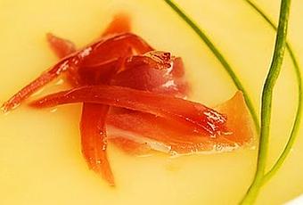 Ingredientes: 1 kilo de carne de melón, 1 chorrito de aceite de oliva, unas gotas de zumo de limón, 100 ml. de nata líquida, virutas de jamónPreparación: