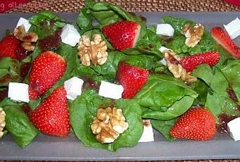 Lavamos las fresas, retiramos lo verde y las troceamos al gusto.Montamos la ensalada en platos grandes poniendo en el fondo las espinacas y por encima las fresas, nueces -troceadas o no-, y trocitos de queso fresco.Los ingredientes de la vinagreta los mezclamos en un bol y vertemos unas cucharadas en cada plato. Con poca salsa es suficiente.Fuente: elblogalternativo