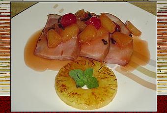 Corta en rebanadas de 1/4 de pulgadaEn una cazuela, añade el resto de los ingredientes excepto la fécula de maíz y las tres cucharadas de agua.Deja que cueza entre 10 a 15 minutos.Disuelve la fécula de maíz en el agua y añádela al glaseado. Deja espesar. Cubre los trozos de jamón con este glaseado. Decora con trozos de piña y cerezas. ¡Buen provecho