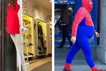 Las dos fotografías fueron hechas en la misma mañana de paseo, uno de estos días, por el centro de Madrid... Ilustran perfectamente la terrible dicotomía que desde hace décadas estamos viviendo: Por un lado vemos las formas estilizadas -hasta los extremos- de las maniquíes, que harían parecer gorda incluso a una víctima de anorexia avanzada... Por el otro las consecuencias de una vida de excesos que propugnan, con más motivo si cabe, en estas fechas navideñas... Lo que dictan los cánones de belleza y aceptación y las consecuencias de vivir en una sociedad que favorece el consumo y el sedentarismo; lo virtual y lo real; lo que marcan los patrones estilísticos y lo que favorece nuestra forma de vida, ambos extremos patológicos, puestos frente a frente en una dicotomía terrible que roza la esquizofrenia social... En la época de los turrones, mazapanes, polvorones, jamones, los días de la sidra y el cava, los de los cotillones, de las cenas de empresa y las cestas de Navidad, se pretende -ya que hemos tocado el tema de los héroes del comic- vender ropa con modelos que, más que reales, parecen familiares de Mister Fantastic.... De verdad: hay que ser superhéroes para ser feliz en un mundo así...