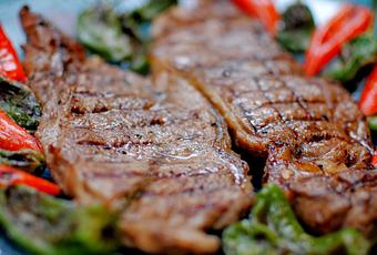 Faltando cuatro minutos para que los pimientos estén ya listos, pones a la parrilla los filetes, dos minutos por lado, para que te salga tierna y jugosa, en su punto.