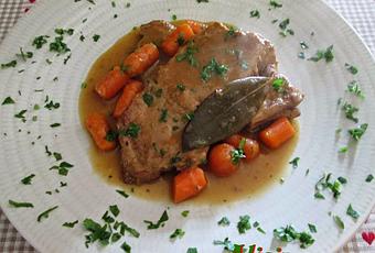 Volvemos a poner la carne y cubrimos con lo batido, añadimos de nuevo el laurel, unos granos de pimienta, la pastilla de caldo, las zanahorias y un vaso de agua. Dejamos que cueza hasta que la carne y las zanahorias se hayan ablandado y la salsa haya reducido. Si en este tiempo no hubieran ablandado, y se hubiera secado demasiado, podéis añadir más agua, pero teniendo en cuenta que debe quedar reducida a su consistencia normal.Servid caliente con abundante perejil picado por encima.