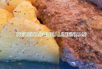 Mojamos los entrecots con parte del adobo, lo colocamos en una fuente de horno y finalemente vertemos el adobo encima de la carne.