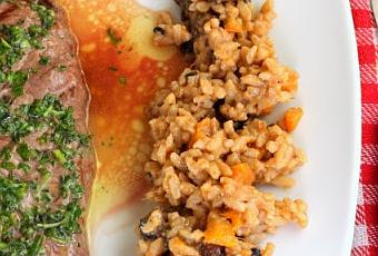 Cuando pasan dos minutos, damos la vuelta a los entrecots y sobre la parte cocinada añadimos una rodaja de nuestro rulo de mantequilla de hierbas. Mientras tanto, vamos recalentando unas sobras de risotto de calabaza y portobello (clic) que hicimos y guardamos congelado y ya tenemos una comida bien completa para hoy.