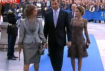 La parte superior de su vestido y las mangas eran de un estilo parecido al que Dña. Letizia lució el año pasado en el concierto anterior a la entrega de los Premios Príncipe de Asturias, un diseño de Felipe Varela en azulón de aire retro.