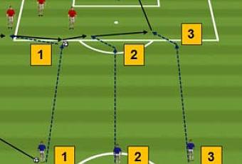 Este es otro ejercicio utilizado en el Inter de Milan por Jose Mourinho. La finalidad de este trabajo es la mejora de la creación de espacios en la defensa rival para ser aprovechados en la ofensiva del equipo. Este ejercicio nos sirve para ejecutar la jugada que realizo el Inter De Milán contra el Bayer The Munich en la final de La Champions league en la cual dos delanteros primero se desmarcan hacia el centro y posteriormente hacia el jugador que logra desbordar por la banda, dichos recorridos logran generar un espacio para la llegada por sorpresa de Sneijder, el equipo de Mourinho suele repetir con algunas variantes dicha jugada. El ejercicio es bastante sencillo y esta explicado mediante gráfico. Realización: Un equipo conformado por tres jugadores se apoyara hacia cualquiera de las bandas, posteriormente recorrerá en la forma mostrada a gran velocidad y con pausa cuando se tenga el balón, posteriormente el jugador 1 recibirá el balón del jugador que ha desbordado por la banda, rápidamente lo pasara al 2 y finalmente al tres. Duración:2 series de 10´ con descanso entre series de 3´.