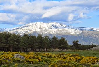 El paisaje a lo largo de la parte más desarbolada de este tramo es amarillo, las genistas ponen esta nota de color, además grandes pinos y bonitas vistas al valle del Lozoya.