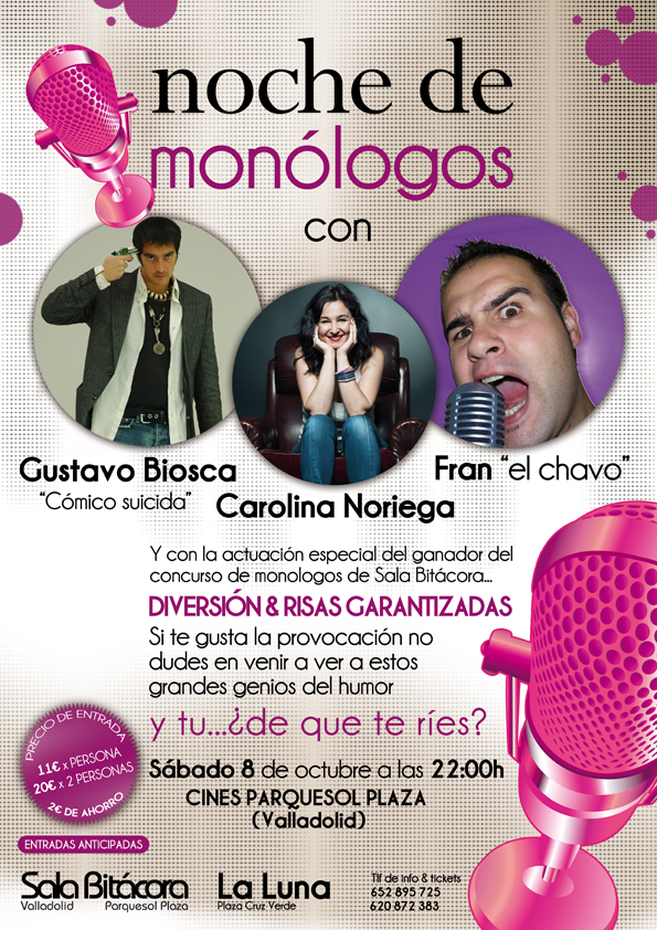 Carolina: Me van a ver a mí, a Gustavo Biosca y a Fran el Chavo. No se pueden perder el venir a verme, porque a parte del monólogo soy muy guapa y llamo mucho la atención (se ríe). Deberían venir solamente por ver una belleza exótica.