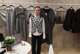 Decido acercarme a su showroom e improvisar una entrevista breve a pie de stand. Kimi va vestida con un pantalón de corte recto en tono negro, combinado con una camisa blanca de líneas limpias y un chaleco de inspiración oriental con seigaiha, un estampado japonés con forma de conchas. Colgadas en las perchas, veo varias prendas minimalistas, sofisticadas y funcionales en tonos grises, marrones y negros, pero me fijo sobre todo en una chaqueta en tono marrón oscuro. También llama mi atención un diseño gris de top y pantalón con abertura. Un pensamiento relámpago se me pasa por la cabeza: “son modelos que se asocian a su diseñadora”.