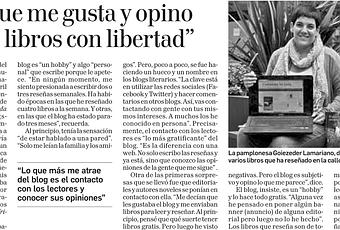 Hoy quiero compartir con todos vosotros dos entrevistas que me han hecho recientemente. La primera me la hizo la periodista y blogera Natalia Pulido para el periódico online Villaviciosa Digital y se publicó el pasado 26 de junio. Desde aquí quiero darle las gracias a Natalia por acordarse de mí y de Cuentos pacientes y pedirle disculpas por no haber podido publicar esta entrada antes. Y la segunda entrevista me la hizo Sonsoles Echavarren para Diario de Navarra. Se publicó en la edición impresa el 25 de agosto. Cómo no, darle las gracias a Sonsoles por acordarse de mí y de Cuéntate la vida para su reportaje sobre blogeros navarros. Aquí os dejo la entrevista en papel. Espero que os guste. Abrazos literarios para todos.