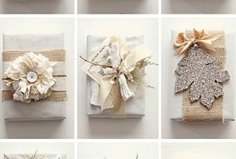Un collage impresionante de texturas, para demostrar que regalos envueltos en papel liso con adornos de tonalidades parecidas no tienen por qué ser aburridos: