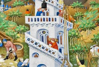 «Los ángeles atacan la Torre de Babel». Libro de Horas de Bedford, París, h. 1410-1430.