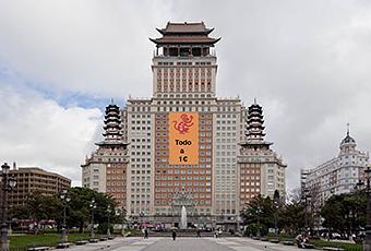 Hemos tenido acceso a la simulación arquitectónica del Grupo Wanda para este edificio. En el mismo se puede observar exóticos remates estilo "pagoda china" y banderola promocional del año chino y venta al detalle. El Grupo Wanda, grupo inversor chino, adquirió en su momento el emblemático edificio España, ubicado en la Plaza de España de Madrid. La polémica de la remodelación y la oposición frontal de las autoridades madrileñas, dejan el proyecto en suspenso.