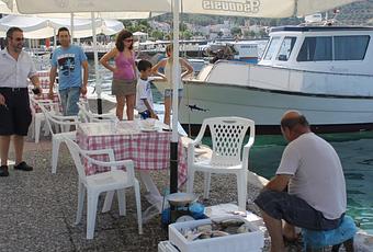 Al otro lado de la calle,un pescador ofrece pescado,fresco, como su mirada griega, forjada con sal marina y oleadas.