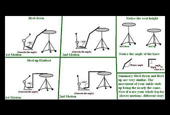 En la técnica de pedales. Hay dos técnicas básicas, que son tocar con talón apoyado (heel down) y talón levantado( heel up) en las cuales, el pie siempre se ubica en la parte media del pedal, y en caso de ser apoyado, la fuerza se realiza mayormente con los músculos que rodean y articulan el tobillo, y la resistencia se ejerce en la zona de los gemelos.